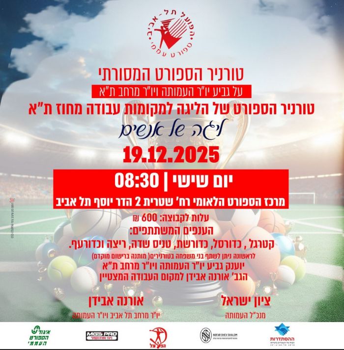 טורניר הספורט(יומי) יתקיים בתאריך 13.12.24 יום שישי בשעה 8:30 במרכז האולימפי הדר יוסף רח' שטרית 2 תל אביב – חניה בשפע